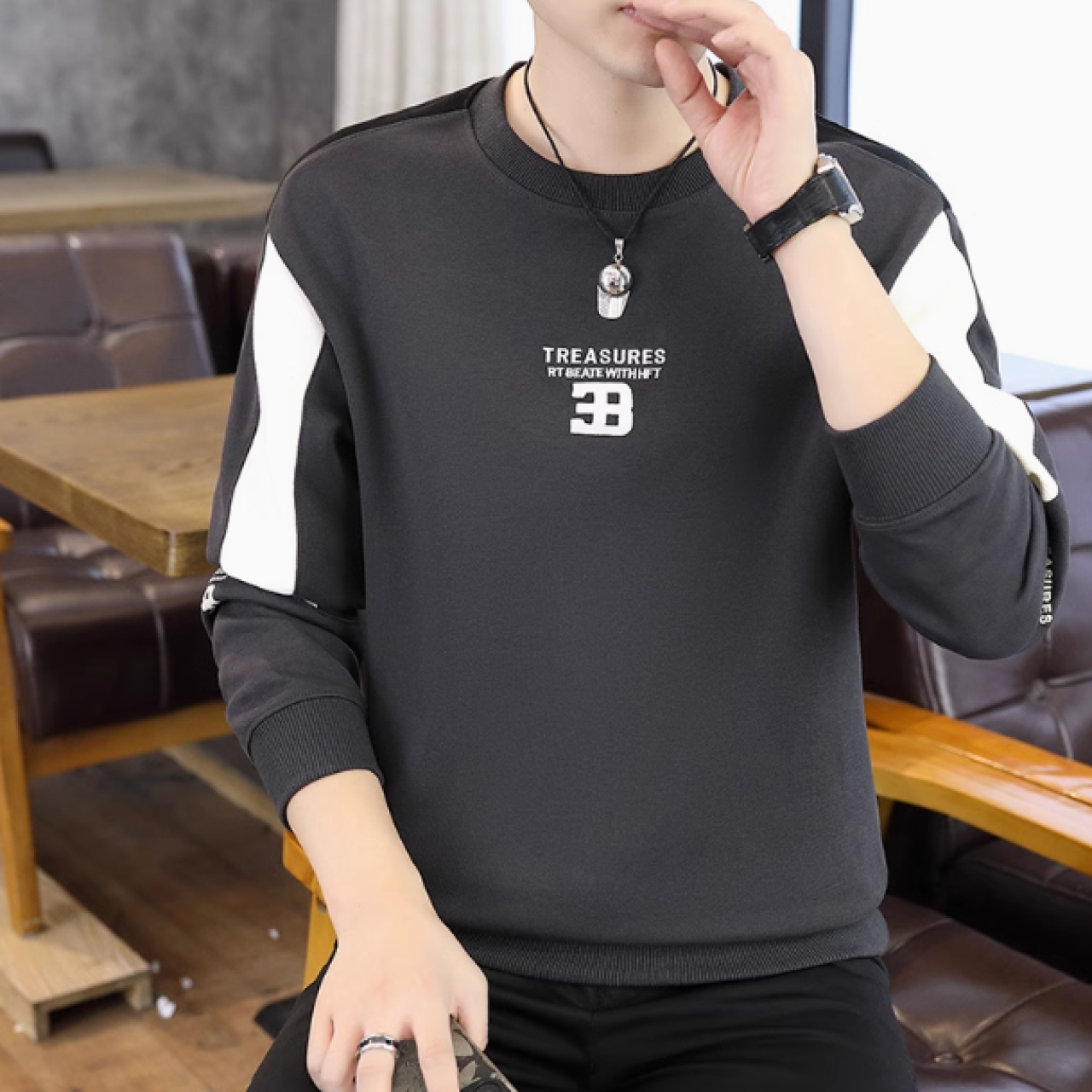 罗蒙男士卫衣春秋季新款潮牌青少年宽松圆领印花假两件长袖T恤男