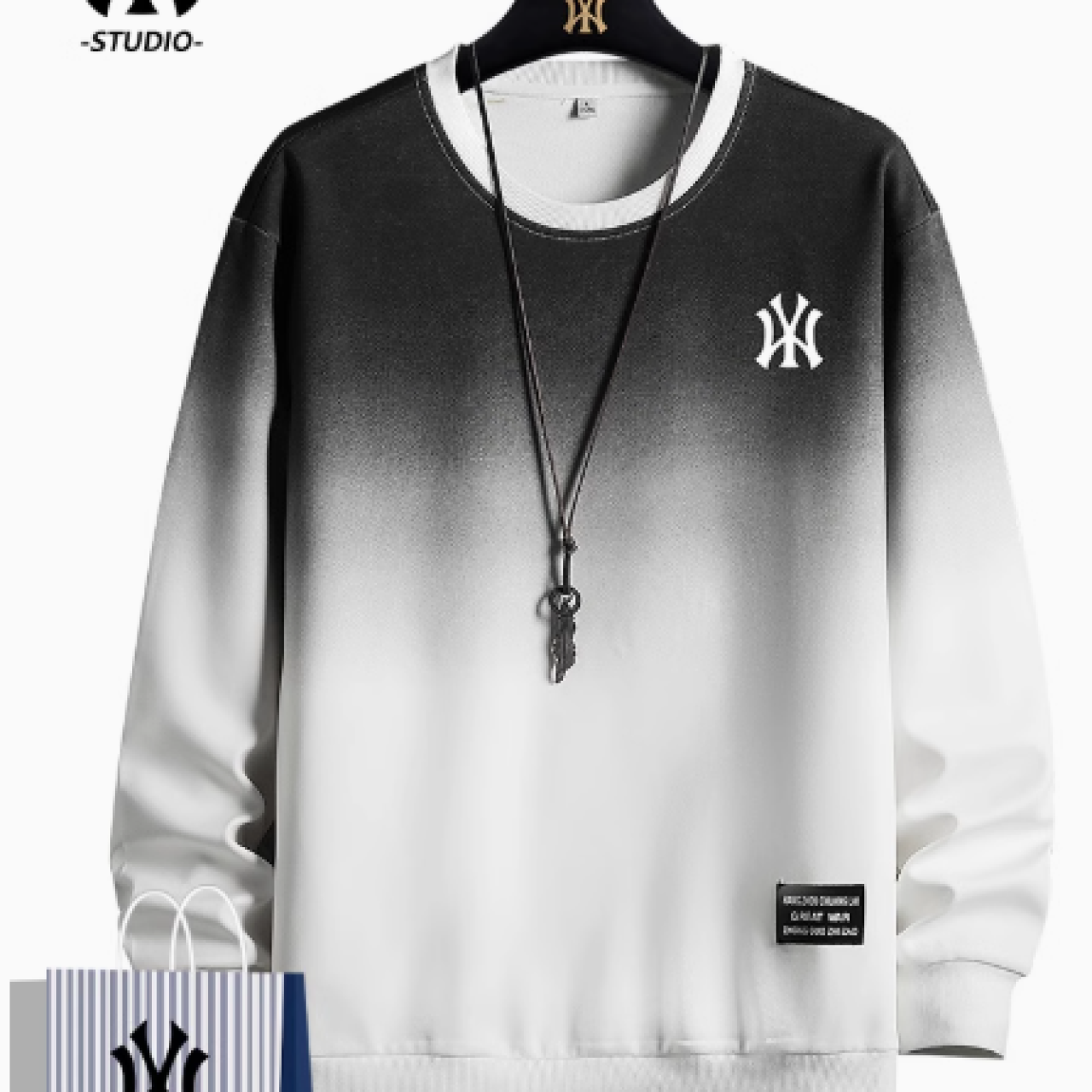罗蒙男士卫衣春秋季新款潮牌青少年宽松圆领印花假两件长袖T恤男